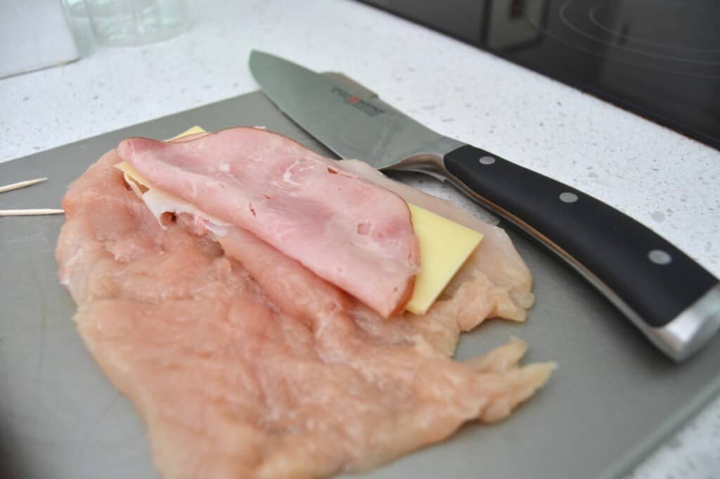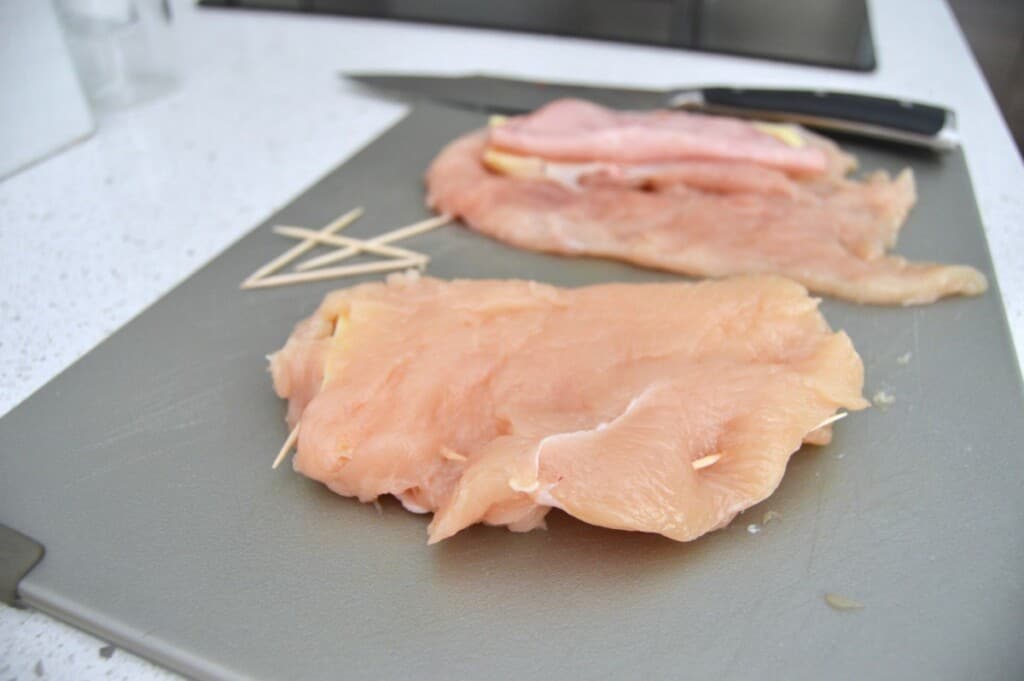 - Place one slice of cheese and one slice of ham on each chicken breast, fold over and hold in place with toothpicks.