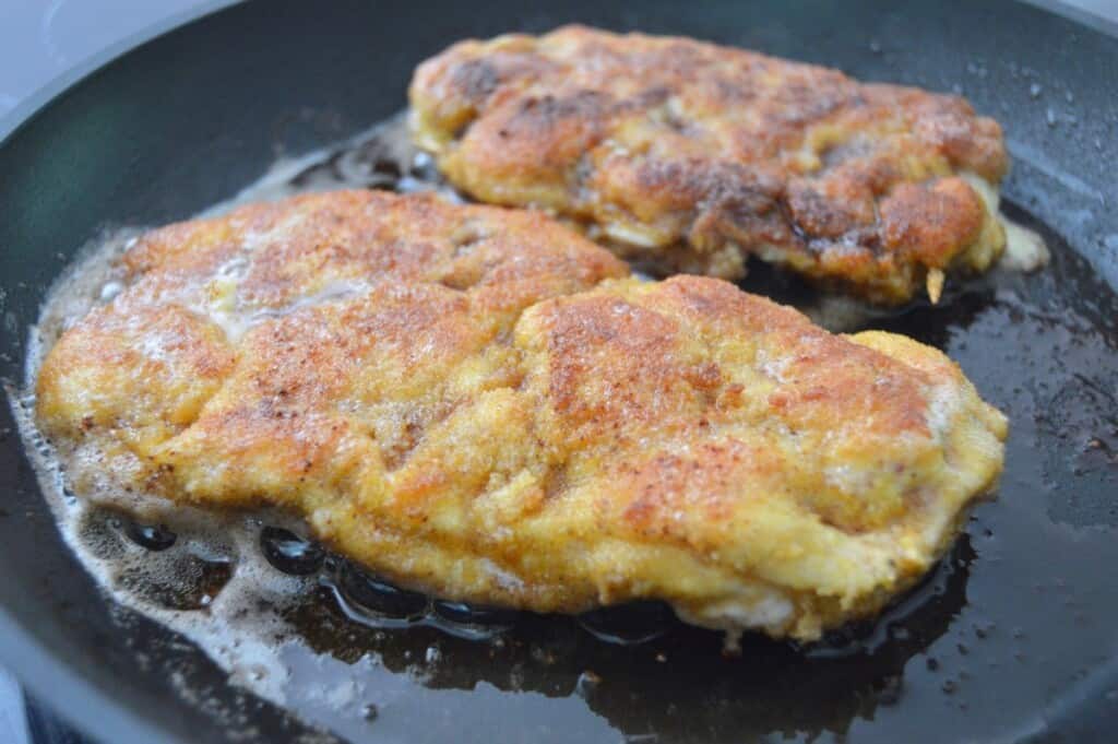 - Heat 2 tablespoon of butter on medium to medium high in a large skillet. Once melted, add the meat and cook on each side for 3 to 5 minutes until golden brown. Transfer to plate covered with paper towel.