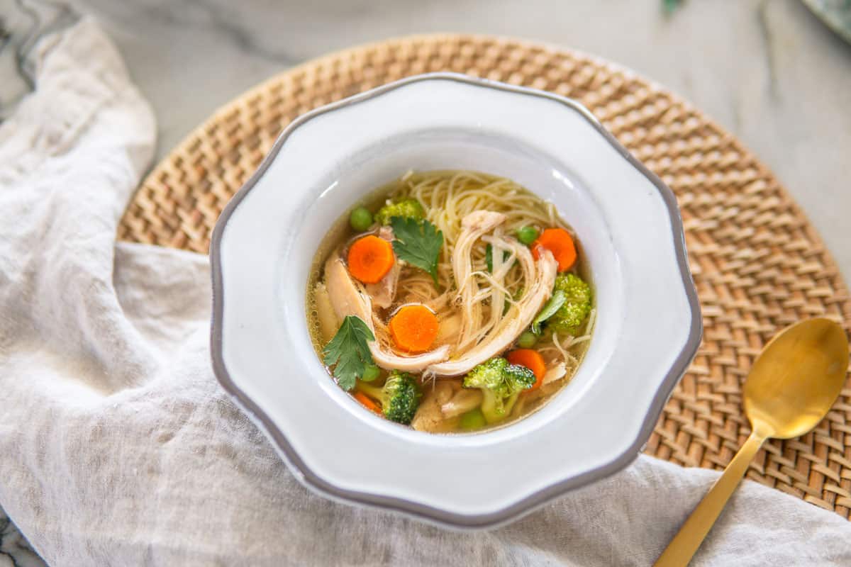 The noodles are cooked separately, so they don't get mushy when sitting in your fridge as leftovers. When warming up the soup, I add more veggies such as peas, sliced carrots, little cauliflower or broccoli florets, and fresh parsley (or chives). I then serve it with cooked noodles and shredded chicken. This is the best chicken noodle soup you'll have, perfect for those cooler months with anti-inflammatory benefits, and I promise not just your kids will love it!