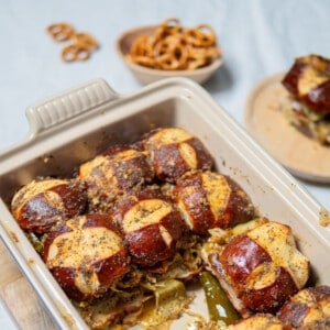 So I used pretzel siders instead of Hawaiian rolls (a solid choice) and added grilled bratwurst, cooked sauerkraut, and sliced pickles into the melty cheese middle. Is your mouth watering yet?? You could go the homemade pretzel sliders route (follow my pretzel buns recipe, then make them half as big).