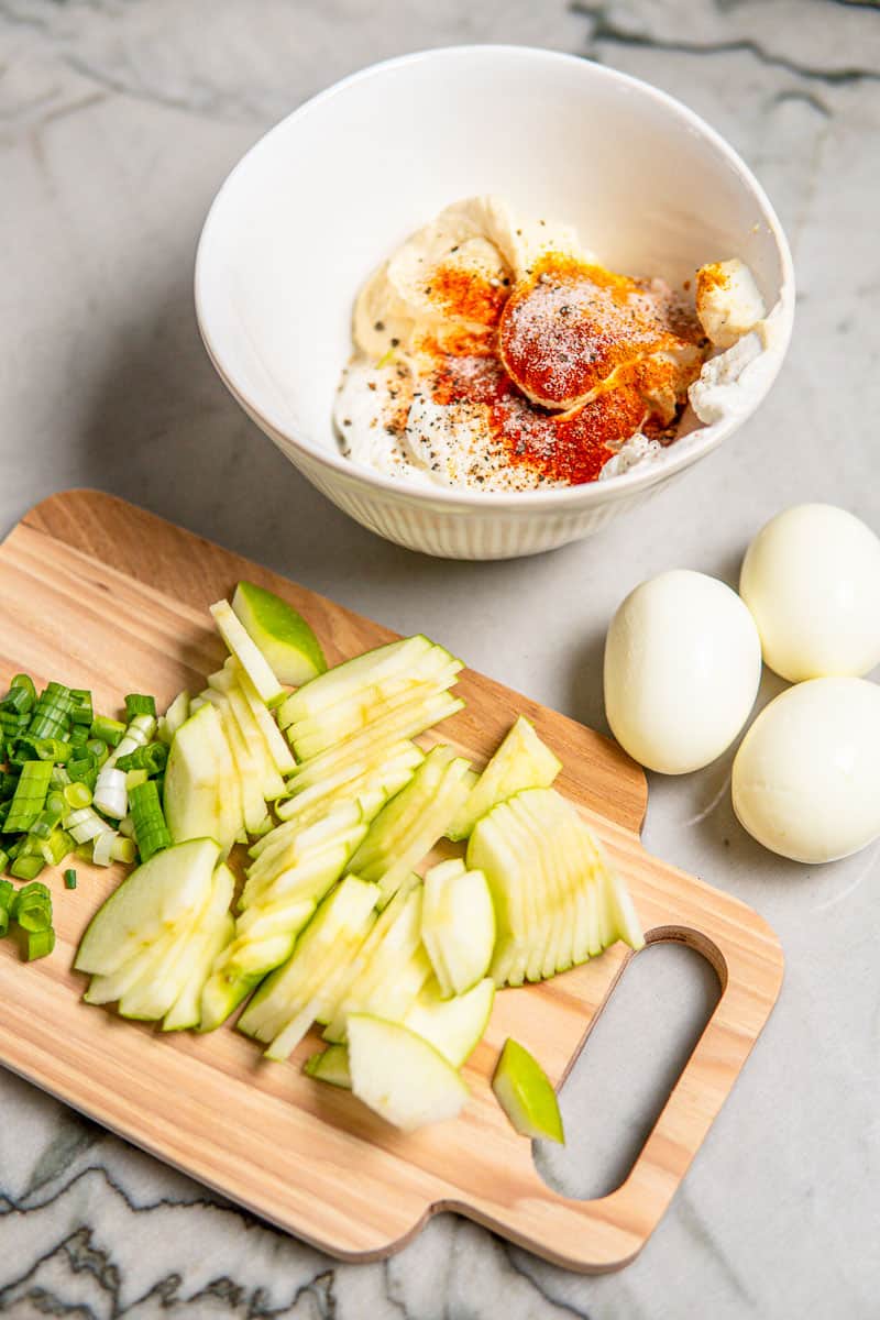 This easy egg salad recipe is made with Greek yogurt, mayo, chives, crisp green apples, curry and paprika powders. I love the refreshing touch from the fresh apple, and the exotic note from the curry powder. It's a German recipe that aims to be on the healthier side, full of flavor and so easy to make!