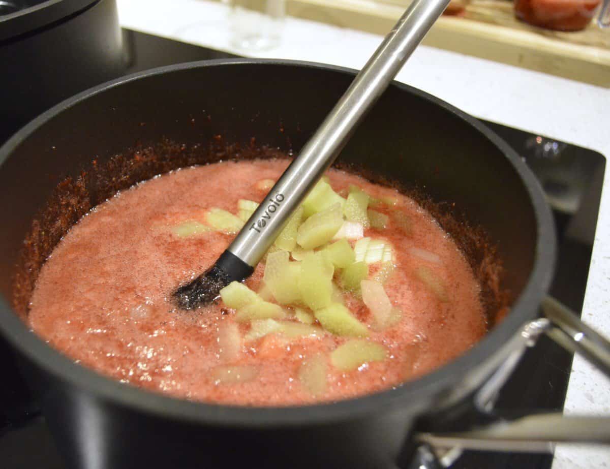 - Pour crushed berries and rhubard into large pot.