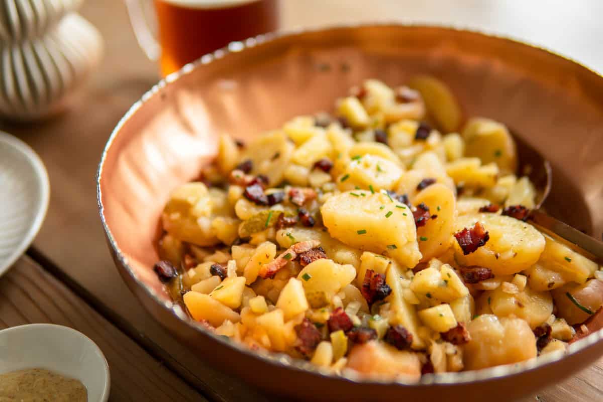 Good pots and pans. To make this recipe, you need a saucepan for heating the warm dressing, a saute pan for crisping the bacon and a large stockpot for boiling your potatoes. I love this 5-layer nonstick and super lightweight pots and pans set made in Saarbrücken, Germany. The pots and pans heat up evenly and are the easiest to clean!