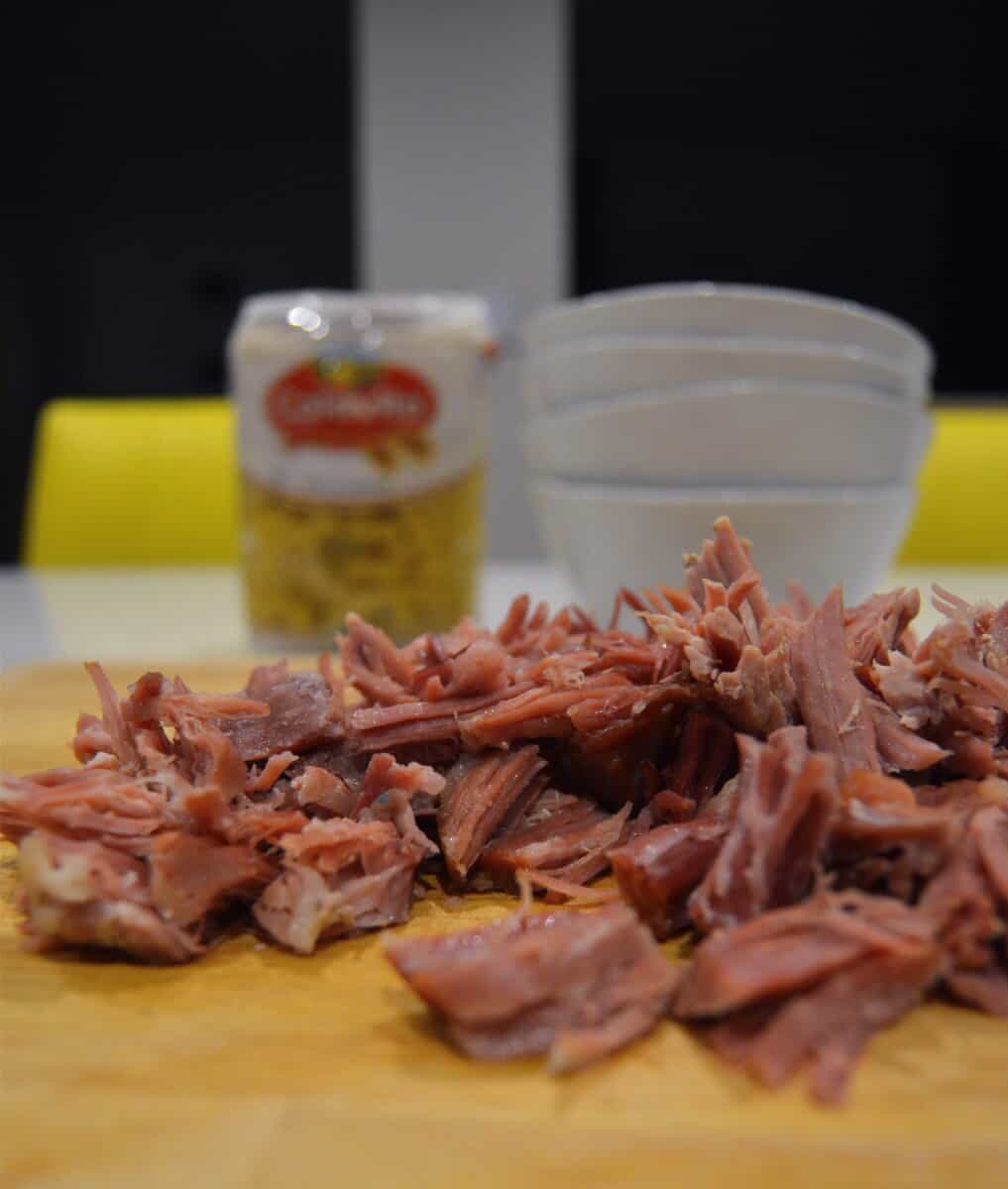 - Now arrange the soup as follows: Boiled pasta, Soup and top off with shredded pork.