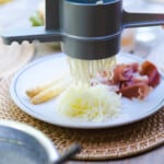 Remove the garlic and using an immersion blender, puree the sauce until foamy. Using the potato ricer or Spätzle press, squeeze the boiled potatoes directly onto four dinner plates and serve with the drained asparagus and ham.